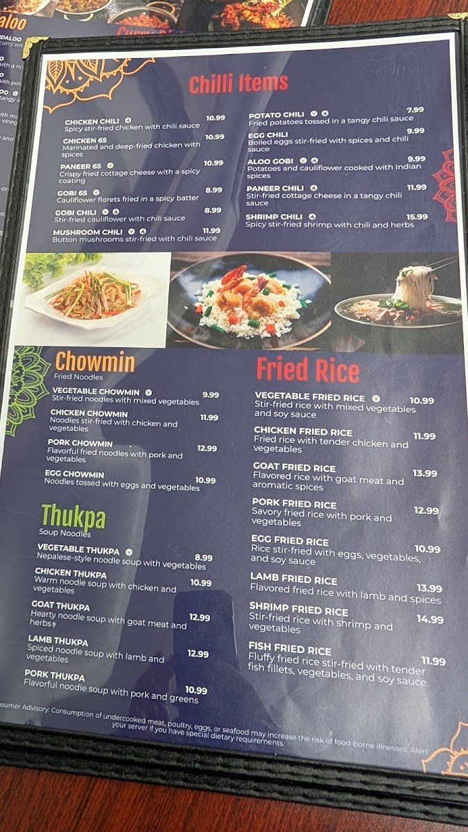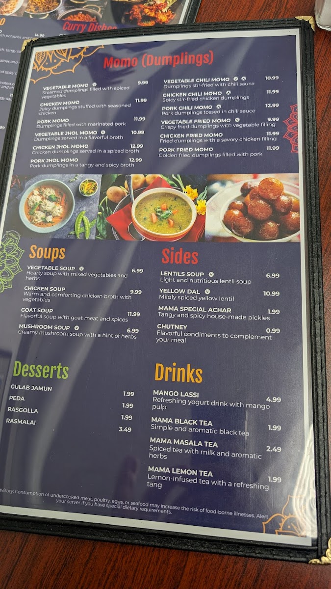 Noodle and rice lovers will appreciate the savory Chicken Fried Rice, Shrimp Chowmin, and hearty Chicken Thukpa, while appetizers like Veg Samosa (3 Pieces) and Paneer Chili set the tone for a flavorful meal. To round out the experience, diners can indulge in traditional desserts such as Rasmalai or Gulab Jamun, and sip on classic beverages like Mango Lassi or Mama Masala Tea.